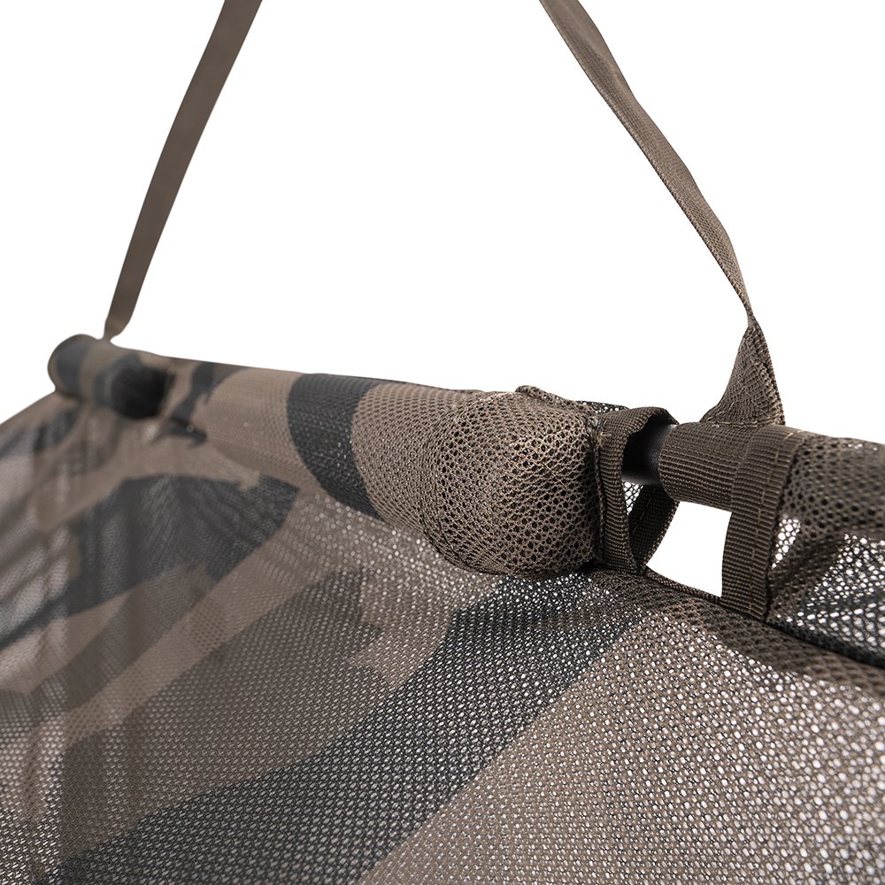Přechovávací sak Camo Recovery Sling byl navržen a vytvořen s důrazem na šetrnost a bezpečnost pro ryby. Na sak je použita velice jemná síťovina, přes kterou velmi dobře proudí voda, což úlovku poskytuje skvělé podmínky, aby po boji nabral sílu a mohl se bez stresu a bezpečně vrátit do hlubin. Nový design v Avid Camo vzoru nejen že vypadá stylově, ale materiál je především lehký, rychleschnoucí a odolný. Provázek na uvázaní je ve fluoro žluté barvě, je na něm žlutý plovák a na konci provázku je šroub, který pasuje do rybářské vidličky. Sak se směrem dolů zužuje, což zajišťuje, že ryby v něm zůstanou vždy v přirozením poloze a nijak se nepřetáčí třeba na bok. Přirozená poloha je důležitá pro jejich rekonvalescenci po souboji. Na mnoho anglických vodách je zakázáno nosit k vodě přechovávácí saky, protože se tam nesmí sakovat. Takže jsou dovoleny pouze vážicí saky. Proto je náš Recovery sling vybaven 4 odnímatelnými plováky, které když jsou oddělané, tak se ze saku stává právě vážící sak. Rybáři tak nemusí vlastnit dva saky, ale vše zvládne náš Recovery sling. Sak je dodáván s vodotěsným obalem, který nejen že brání vytékání vody během přepravy, ale také zadržuje nepříjemný zápach. Camo Recovery Sling je k dispozici ve velikosti Standard a XL