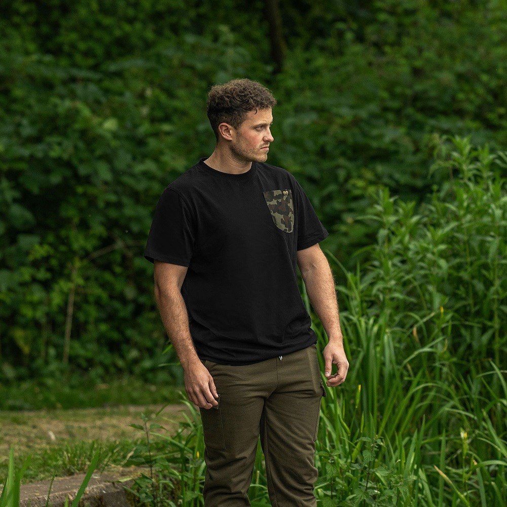 Černé triko s kamuflážovou kapsou.• Decentní logo