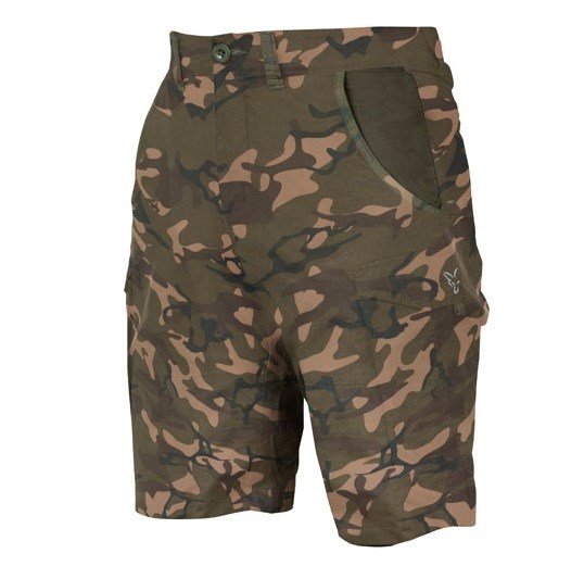 Kraťasy ve Fox Camo vzoru s elastickým pasem s očky pro pásek.