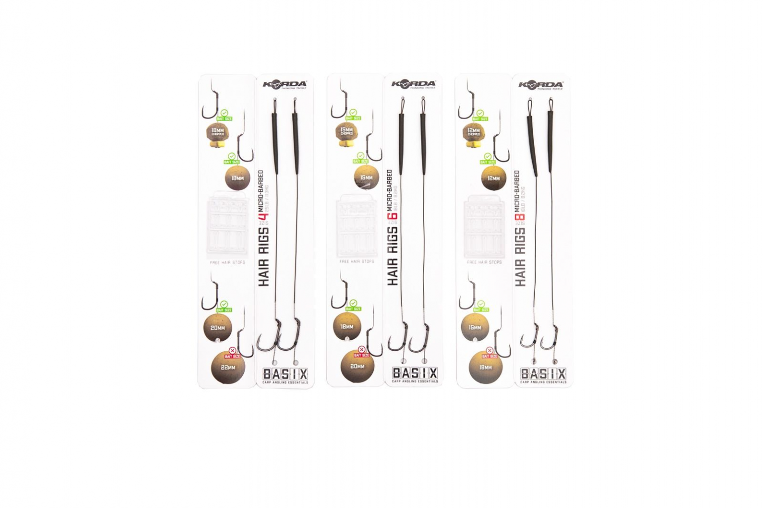 BASIX Ready Tied Hair Rigs jsou hotové návazce které stačí jen vytáhnout z balení a jsou připraveny k použití. Vše, co jen musíte udělat, je přidat boilie nebo waftersky, a můžete nahodit! Tyto montáže jsou navázané z nové potahovaní šnůrky v Camo verzi BASIX Coated Hooklink která je stažená před háčkem BASIX Wide Gape, tak aby měl háček volný pohyb a efektivněji se zasekával. Vlas na navléknutí boilie je opatřen kouskem silikonu, který drží boilie na místě a pomáhá předcházet zamotání, délka těchto vlasu byla optimalizována k velikosti nástrah, které odpovídají zvolené velikosti háčku. Velikost 8 je určena pro nástrahy 12 mm, velikost 6 pro 15 mm a velikost 4 pro 18 mm. Každý návazec je dodáván s několika zarážkami a různě velkými zarážkami Extenda, které vám umožní měnit délku vlasů a používat různé kombinace návnad, pro které je návazec určen. Montáž je zakončena smyčkou a opatřena převlekem proti zamotání BASIX, to umožňí rychlé a snadné připevnění k sestavě BASIX Lead Clip Leader nebo BASIX Lead Clip Action Pack (která zahrnuje QC obratlíky). Dodává se v balení po 2 kusech - k dispozici ve velikostech háčků 4, 6 a 8 v provedení s protihrotem nebo bez protihrotu"| Název | Dostupnost | Cena / ks | Počet kusů |