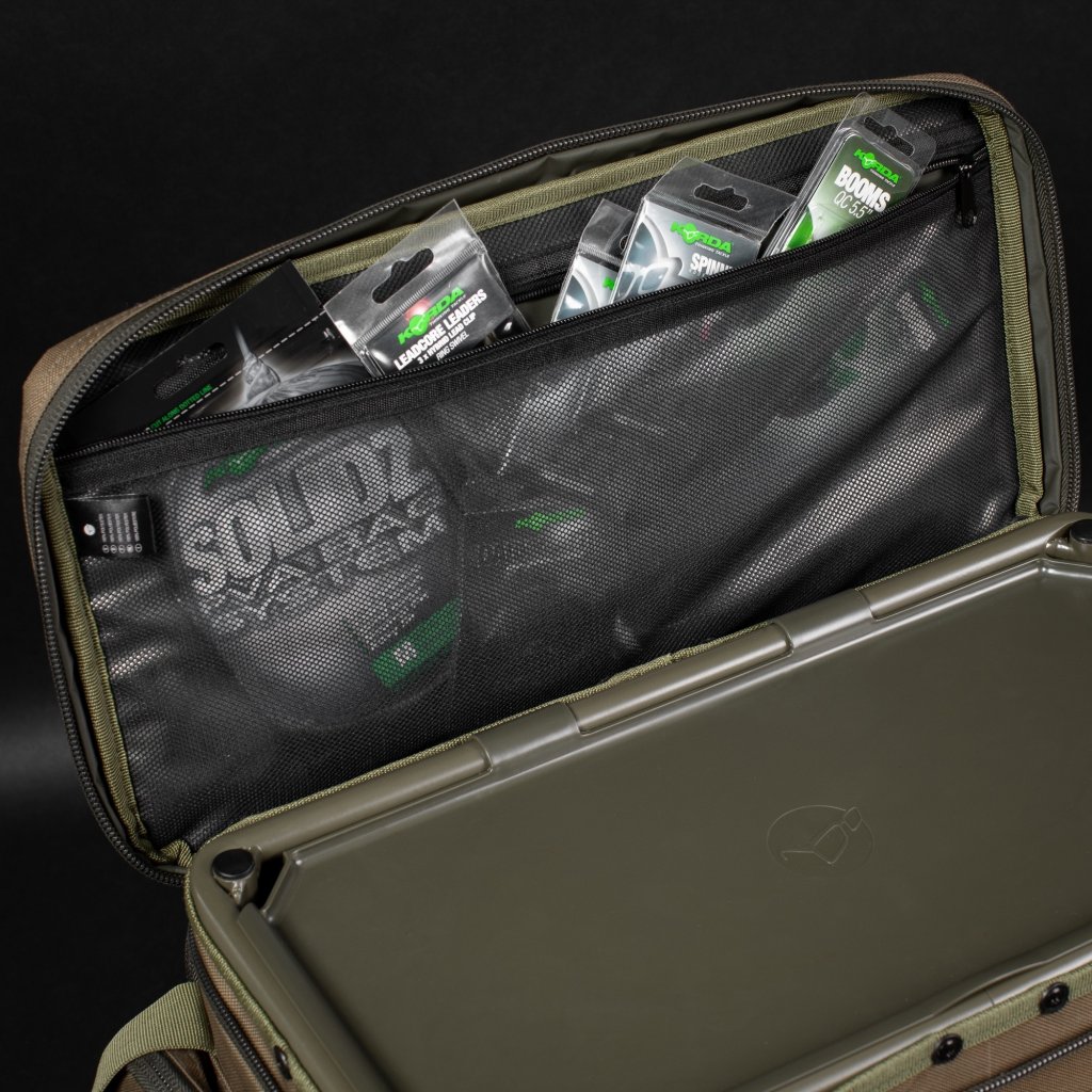 Přední kapsa je dostatečně velká, aby se do ní vešel Korda Tackle Box, což pomáhá maximalizovat prostor v hlavní přihrádce. Přední kapsa je vybavena dvěma vnitřními organizéry, které lze nastavit podle vašich individuálních požadavků, zatímco boční kapsy mají tvarované průchodky pro snadný přístup k nabíjecím kabelům.