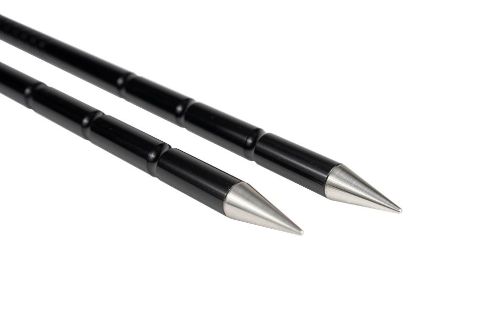 Tělo z eloxovaného hliníku je vybaveno drážkami pro uchycení vlasce, které nabízejí spoustu bezpečných míst pro rovnoměrné a úhledné „omotání“ vlasce bez sklouzávání. Visličky jsou precizně opracované s hladkým profilem, takže se po navinutí vlasec snadno odlepí. Tři větší drážky směrem ke spodní části tyčí poskytují místa pro upevnění měřicí šňůry v závislosti na hloubce zapíchnutí tyče do země. Hrot je vyroben z nerezové oceli, která má mnohem větší hustotu než lehké hliníkové tělo, což zvyšuje pevnost tyče a pomáhá zapíchnutí vidličky i do tvrdších povrchů u vody.