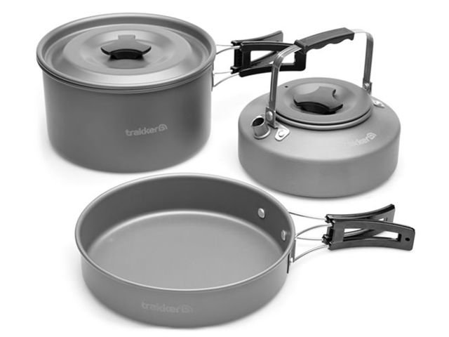 Set zahrnuje hrnec s pokličkou, pánvičku a konvičku. Hodí se perfektně pro pobyt u vody tím, že Vám umožní připravit bezpočet pokrmů a nezabírá téměř žádné místo v tašce – to zajišťují sklápěcí žáru odolná držadla a možnost konvičku vměstnat do hrnce a pánvičkou jej přikrýt. Celý set se vejde do obalu ze síťoviny, který je součástí balení a drží vše u sebe. Kompletní set váží 651g, je vyroben z lehkého hliníku, který byl eloxovaný, což mu dodává elegantní šedivé zabarvení.